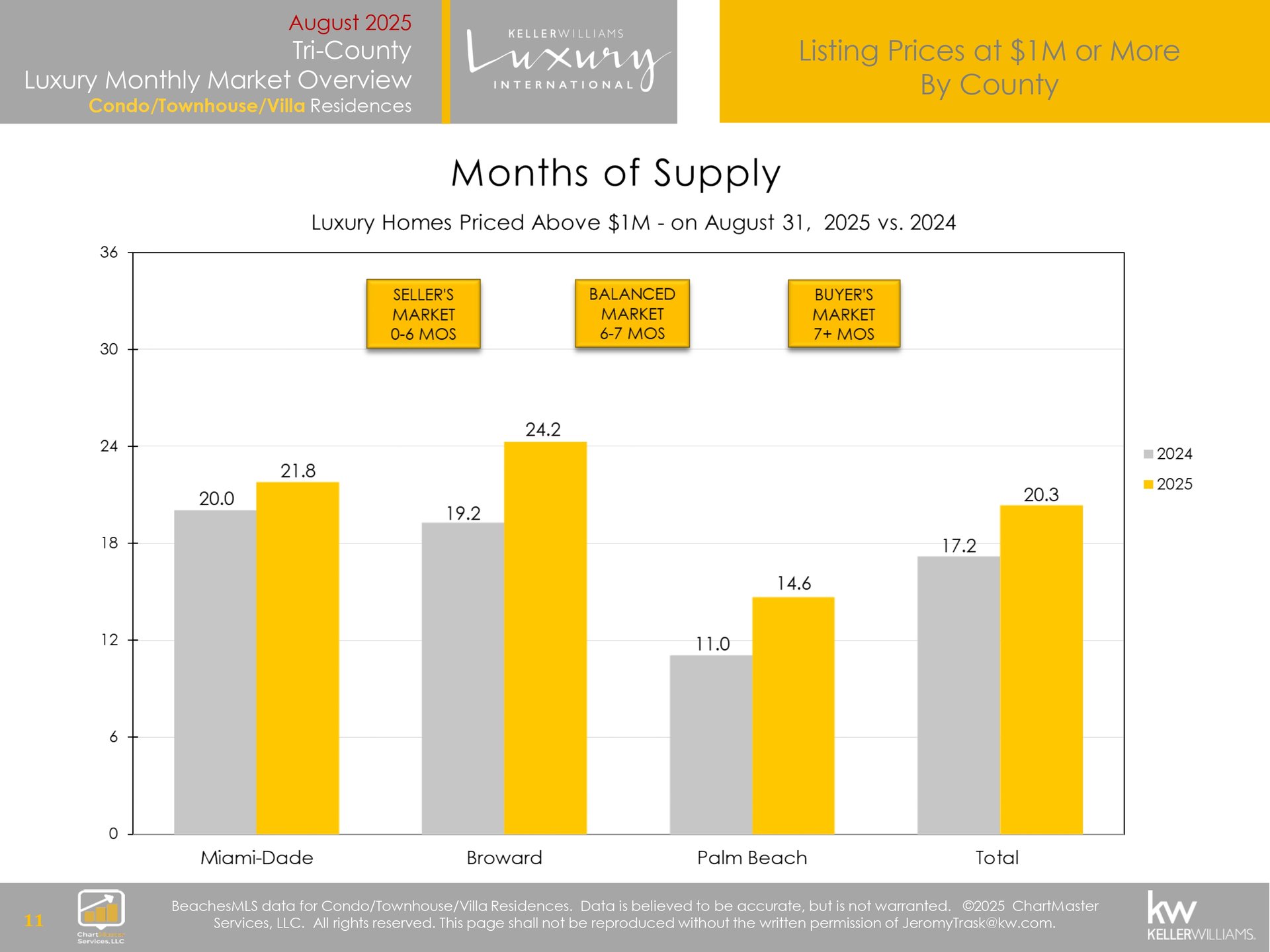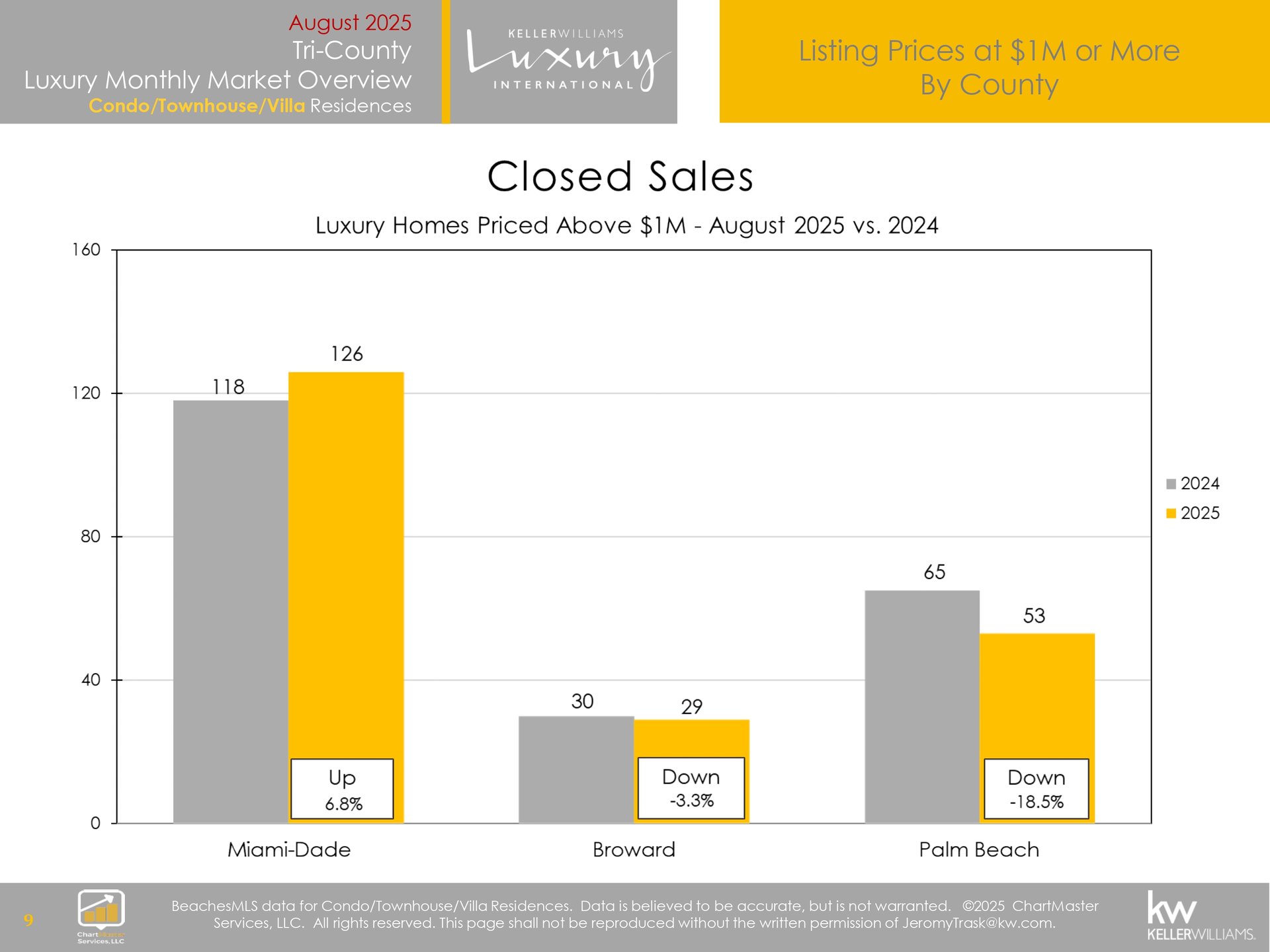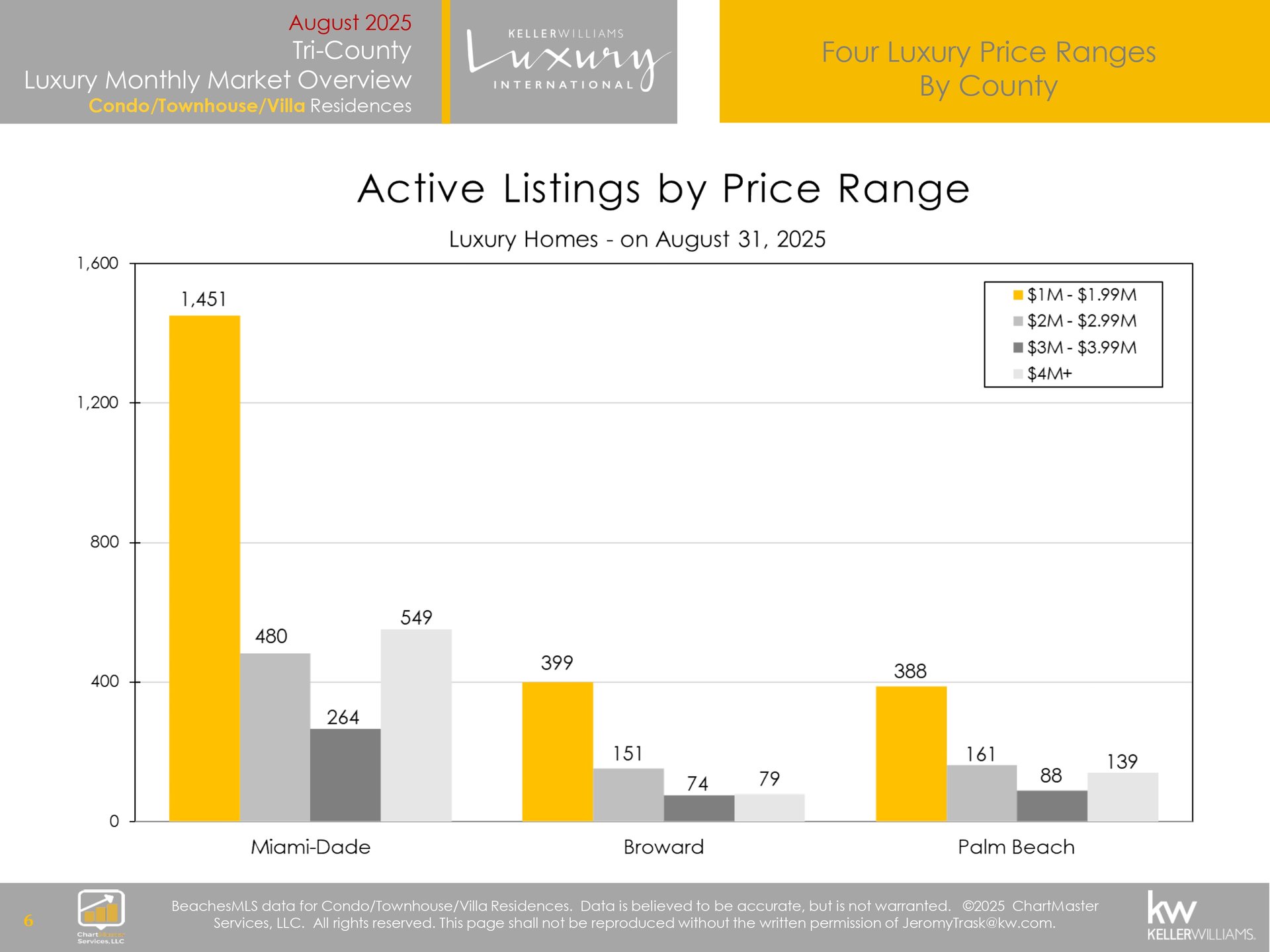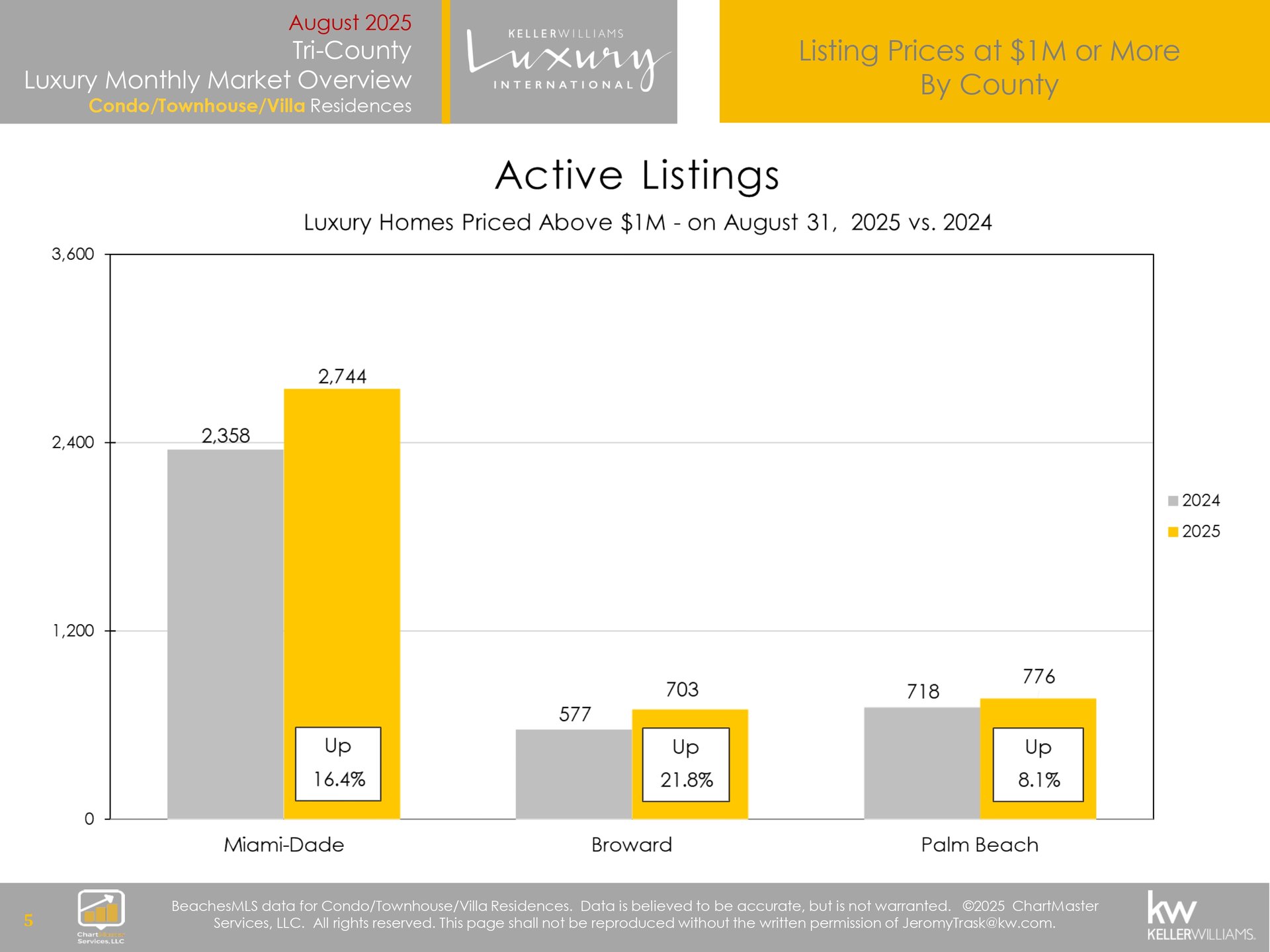 Next, let’s explore the luxury market—Condos, Townhouses, and Villas priced at $1 million and above. This year-over-year review across Miami-Dade, Broward, and Palm Beach counties provides insights into trends in pricing, sales, and inventory for high-end properties.