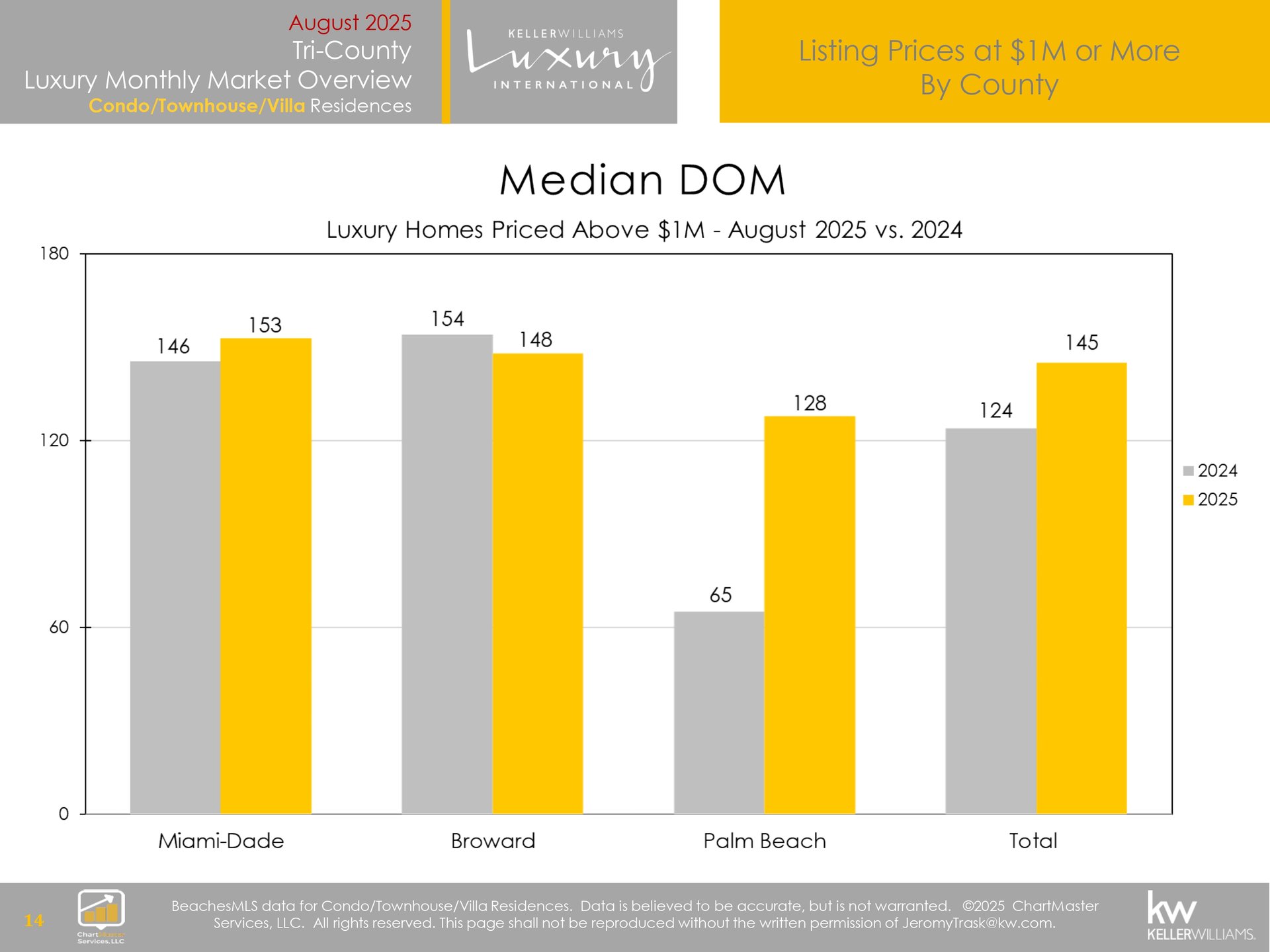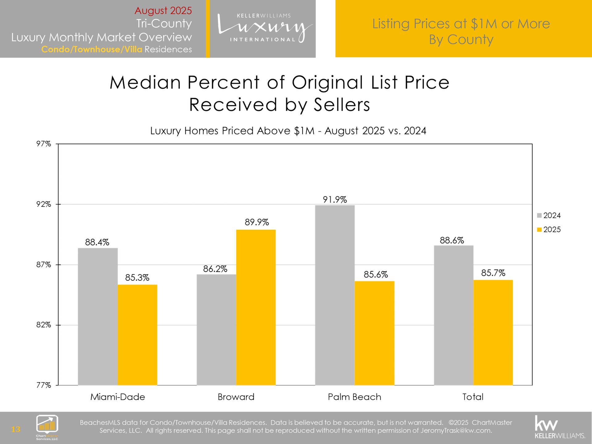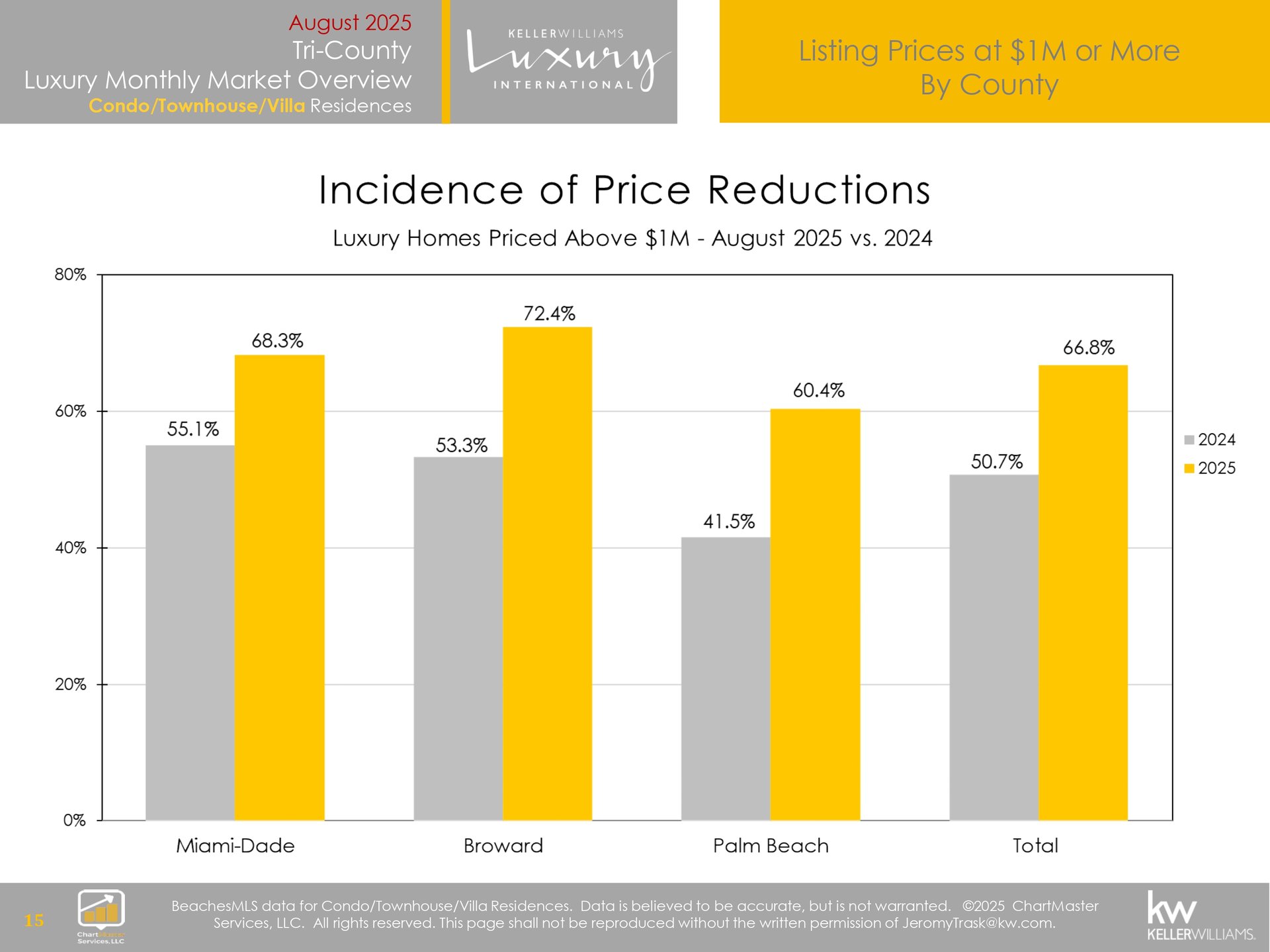 Next, let’s explore the luxury market—Condos, Townhouses, and Villas priced at $1 million and above. This year-over-year review across Miami-Dade, Broward, and Palm Beach counties provides insights into trends in pricing, sales, and inventory for high-end properties.