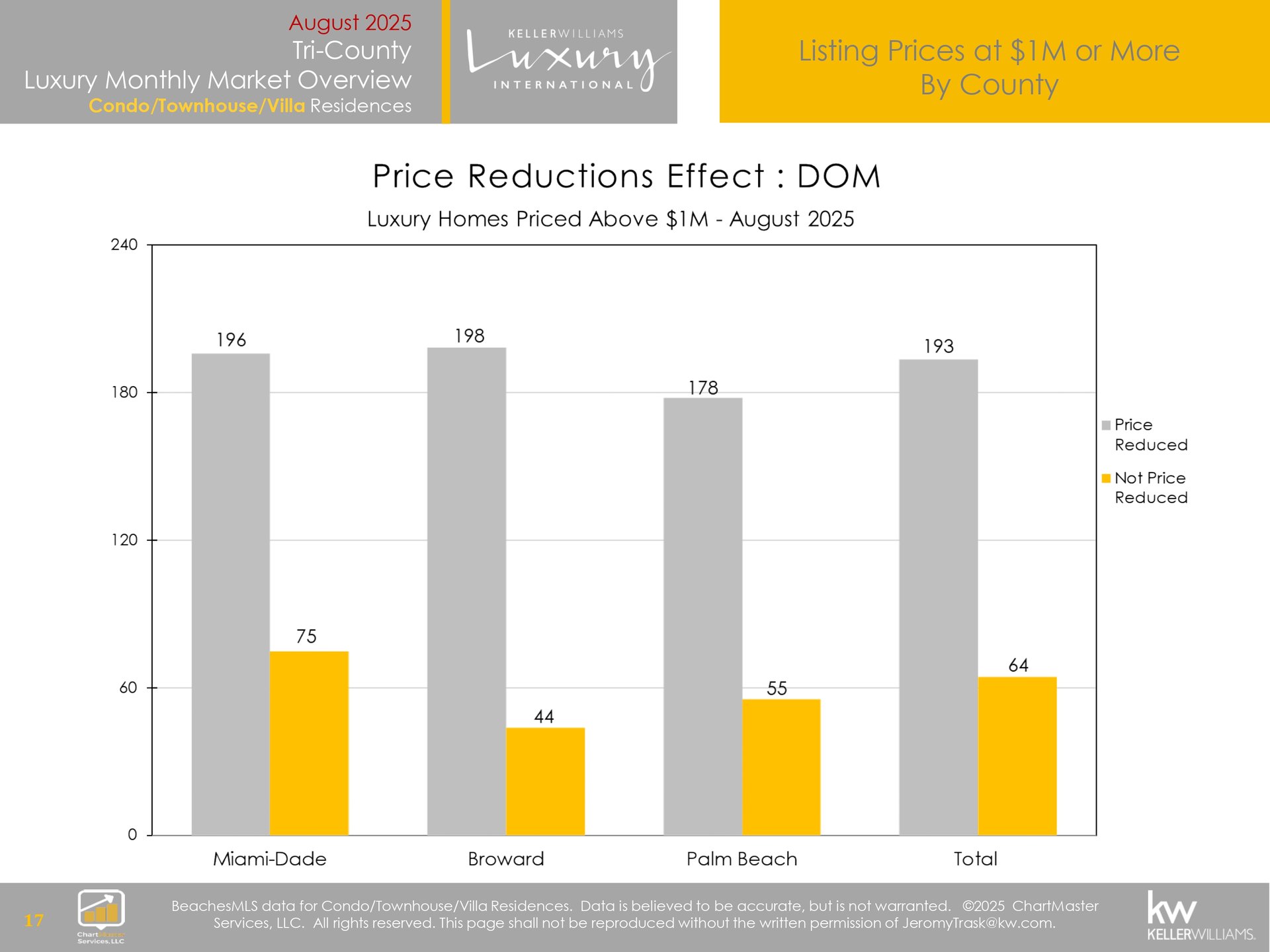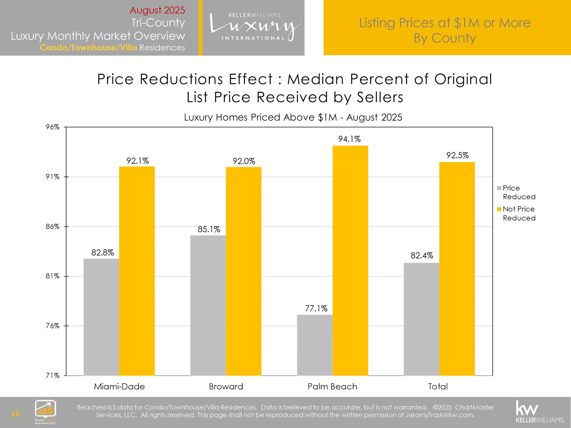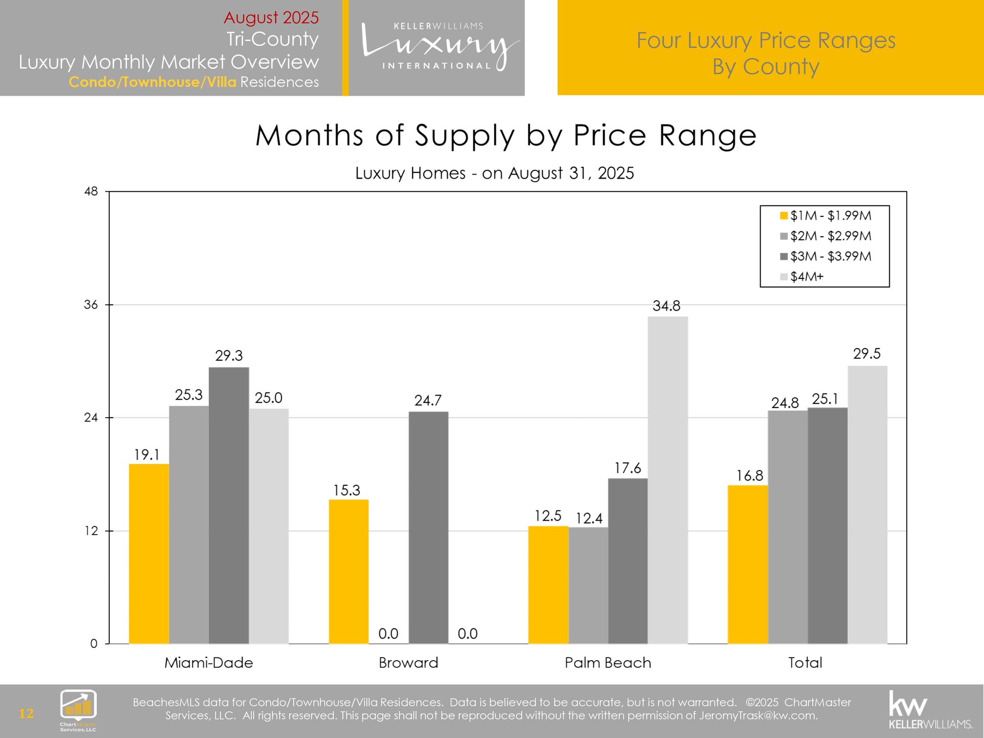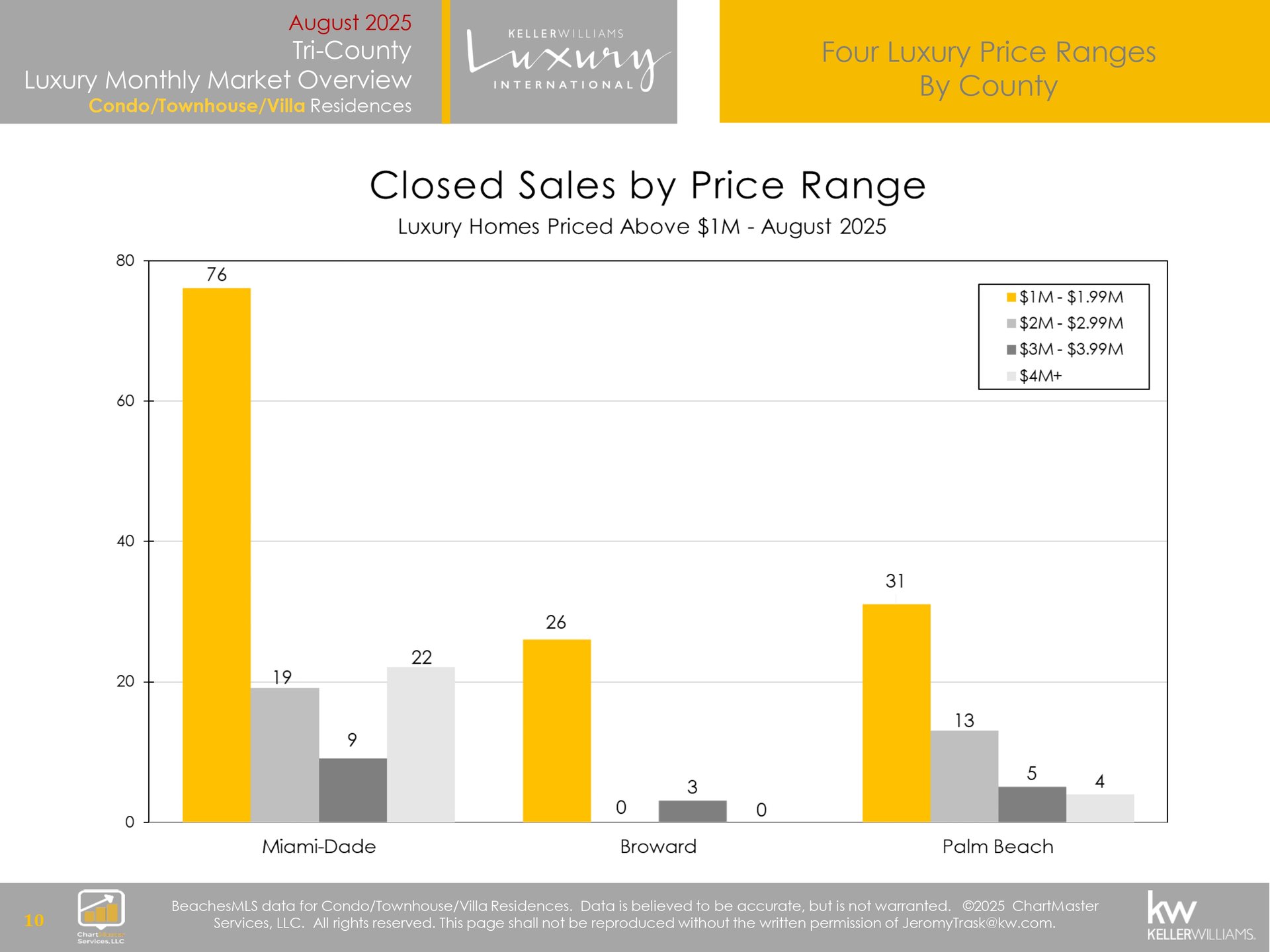 Next, let’s explore the luxury market—Condos, Townhouses, and Villas priced at $1 million and above. This year-over-year review across Miami-Dade, Broward, and Palm Beach counties provides insights into trends in pricing, sales, and inventory for high-end properties.