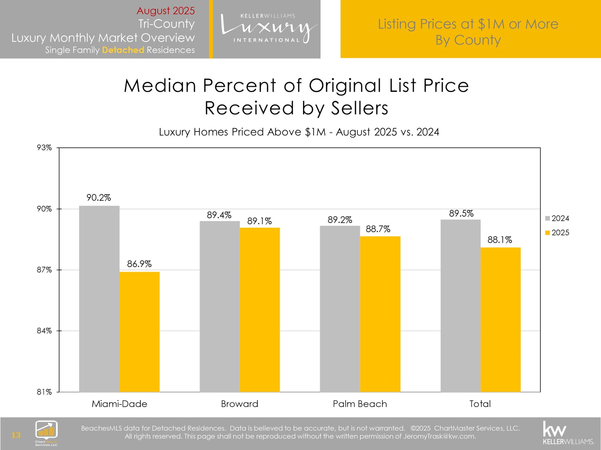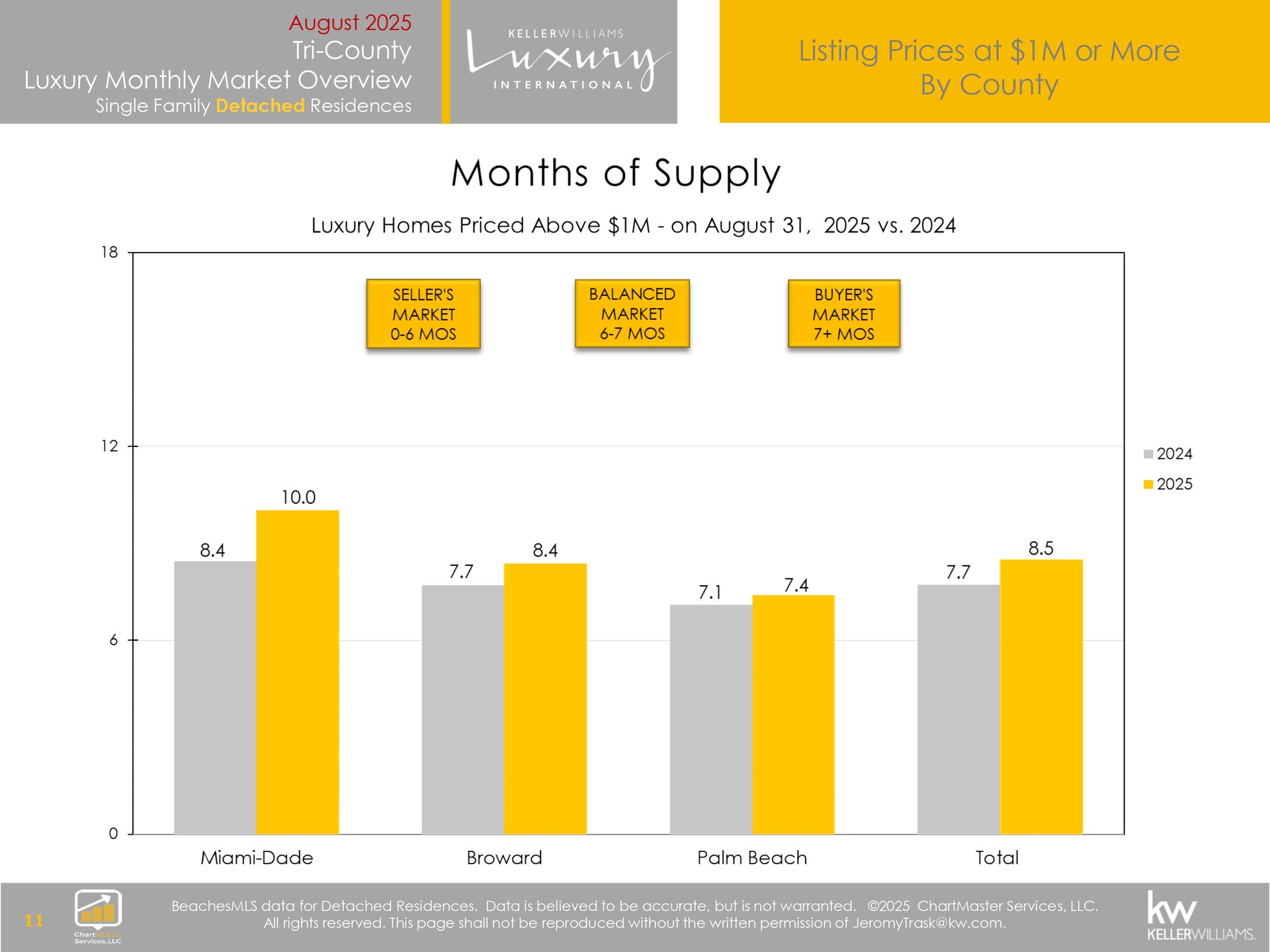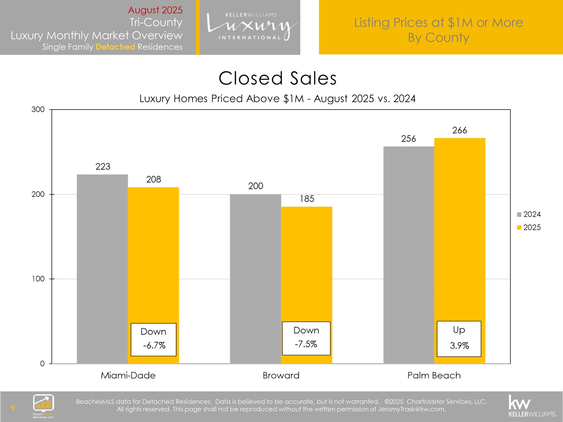 Next, let’s explore the luxury Single Family Home market—properties priced at $1 million and above. This year-over-year review across Miami-Dade, Broward, and Palm Beach counties provides insights into trends in pricing, sales, and inventory for high-end homes.