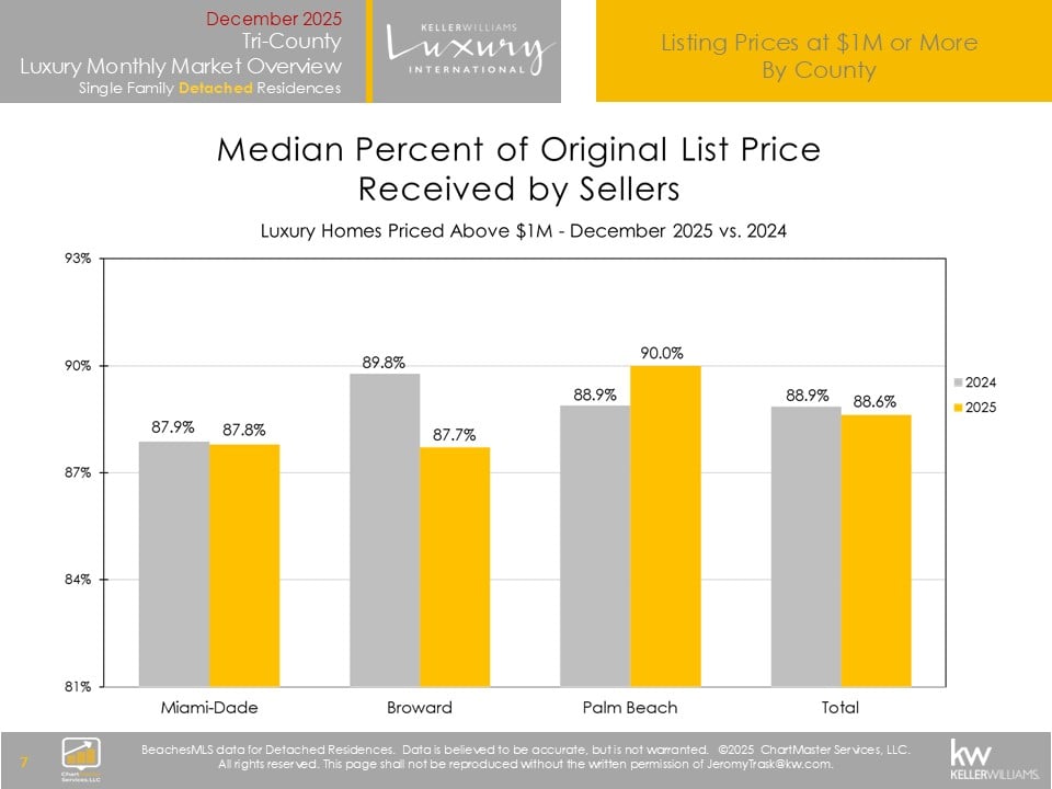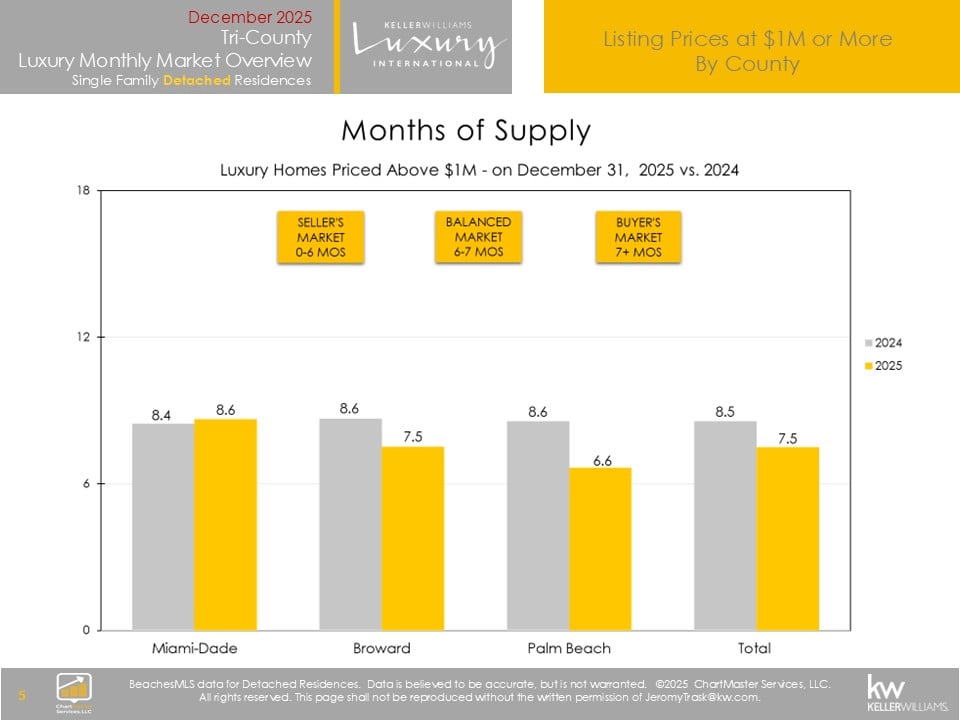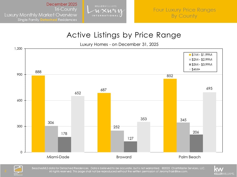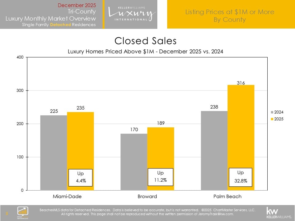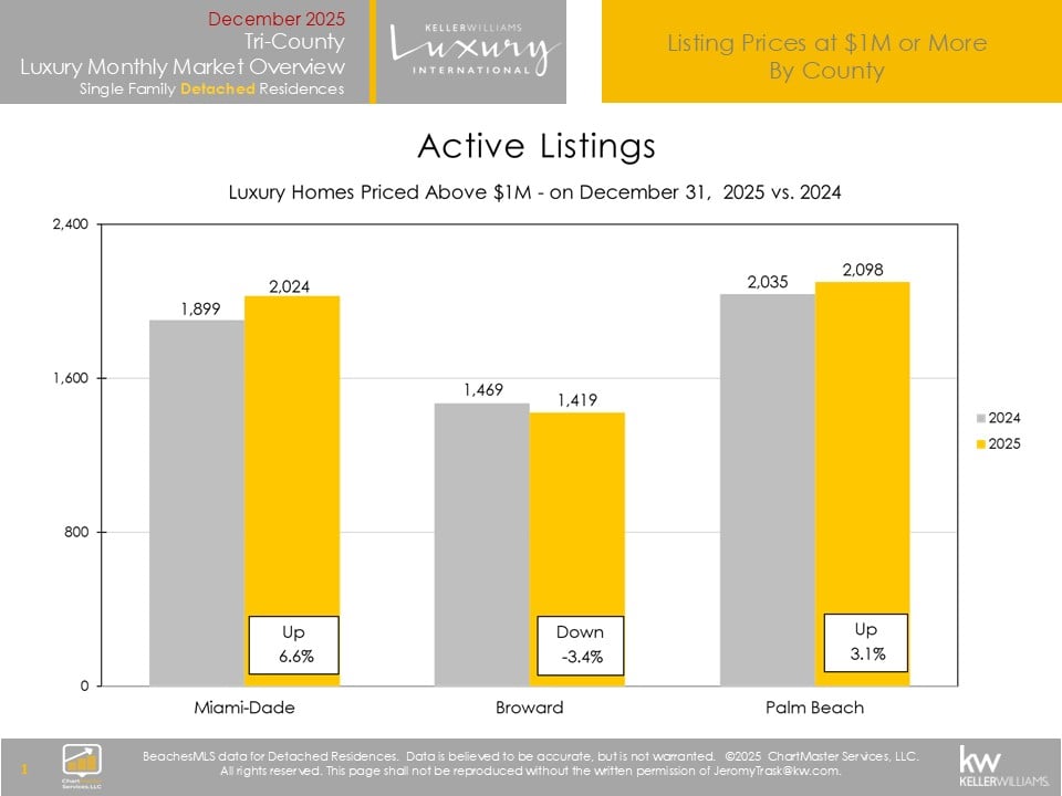 Next, let’s explore the luxury Single Family Home market—properties priced at $1 million and above. This year-over-year review across Miami-Dade, Broward, and Palm Beach counties provides insights into trends in pricing, sales, and inventory for high-end homes.