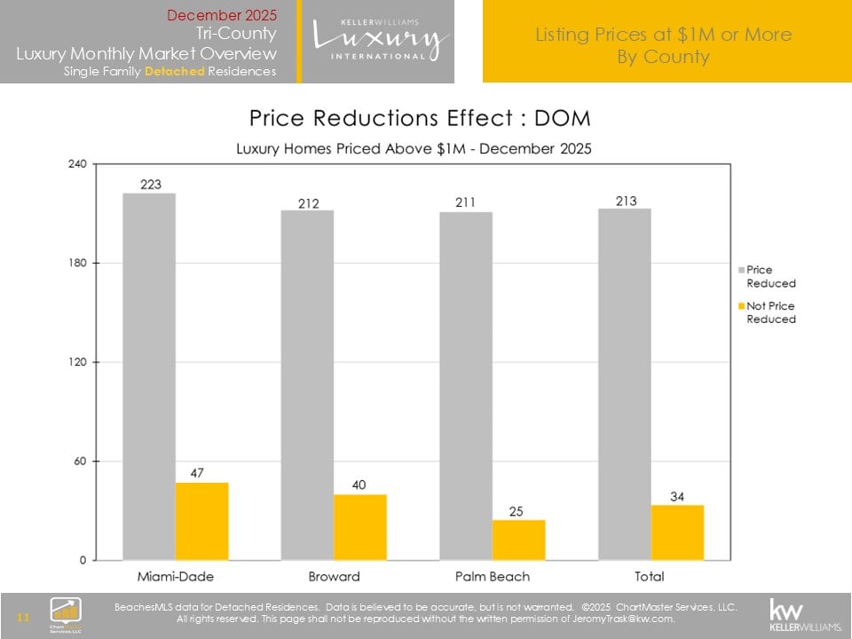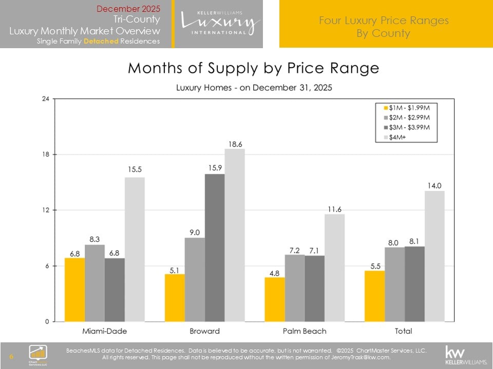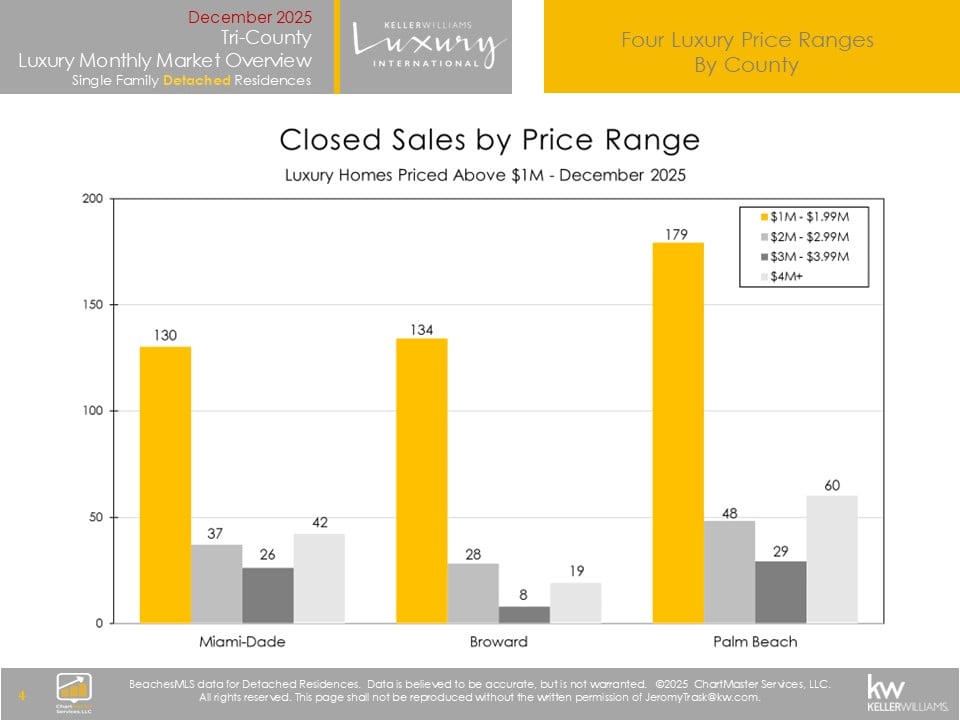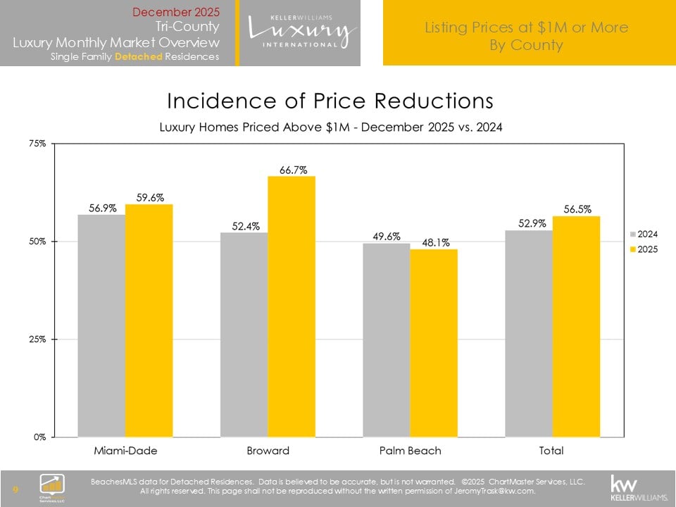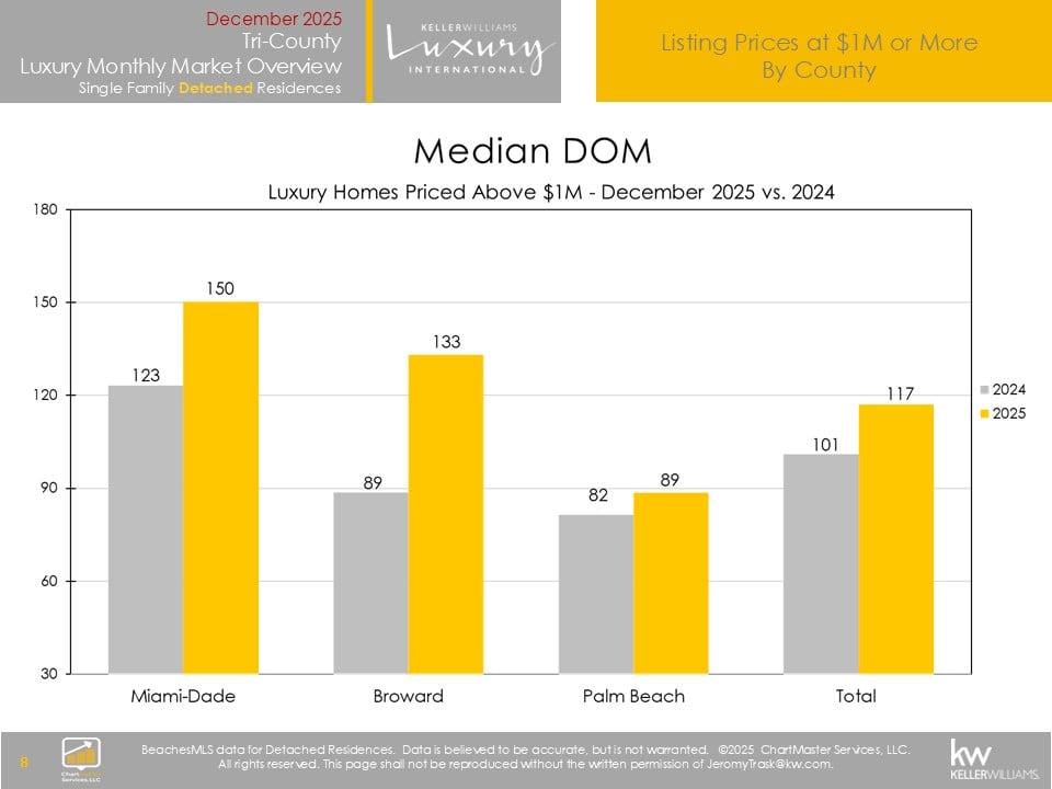 Next, let’s explore the luxury Single Family Home market—properties priced at $1 million and above. This year-over-year review across Miami-Dade, Broward, and Palm Beach counties provides insights into trends in pricing, sales, and inventory for high-end homes.