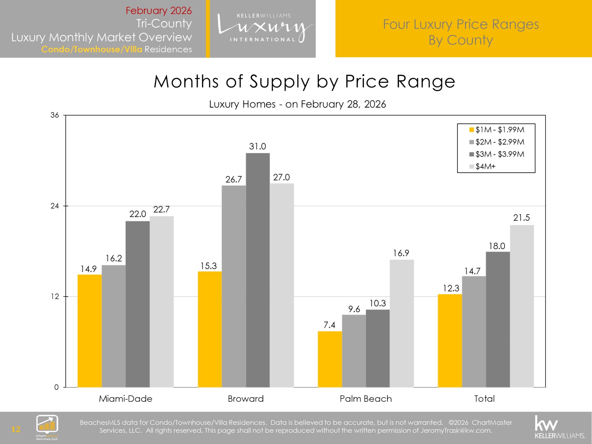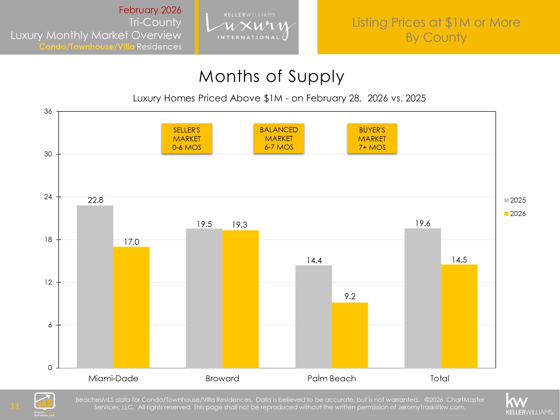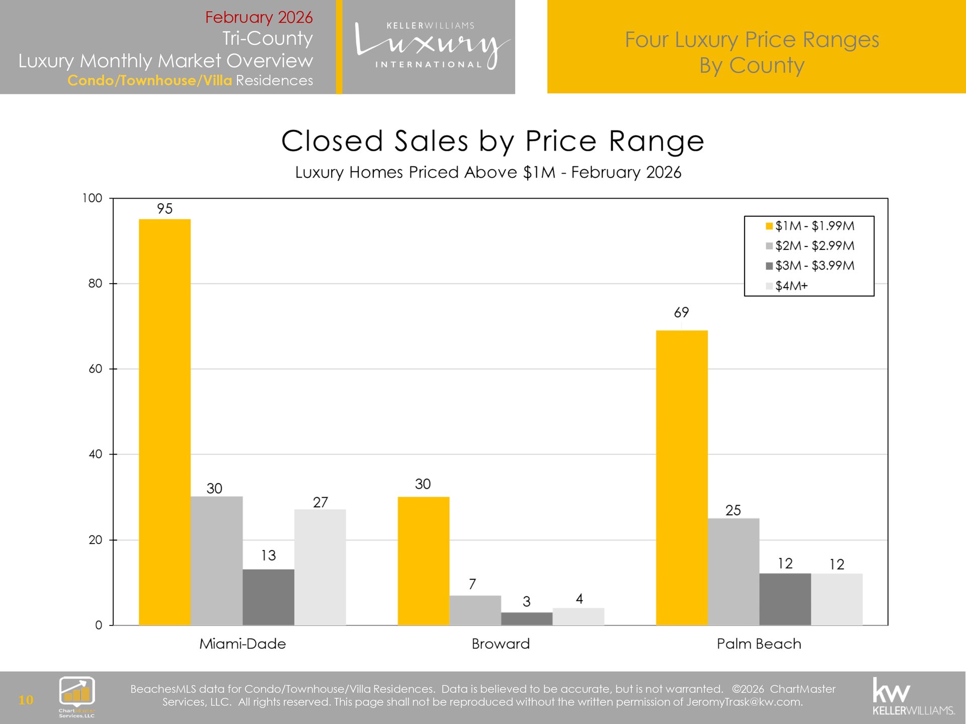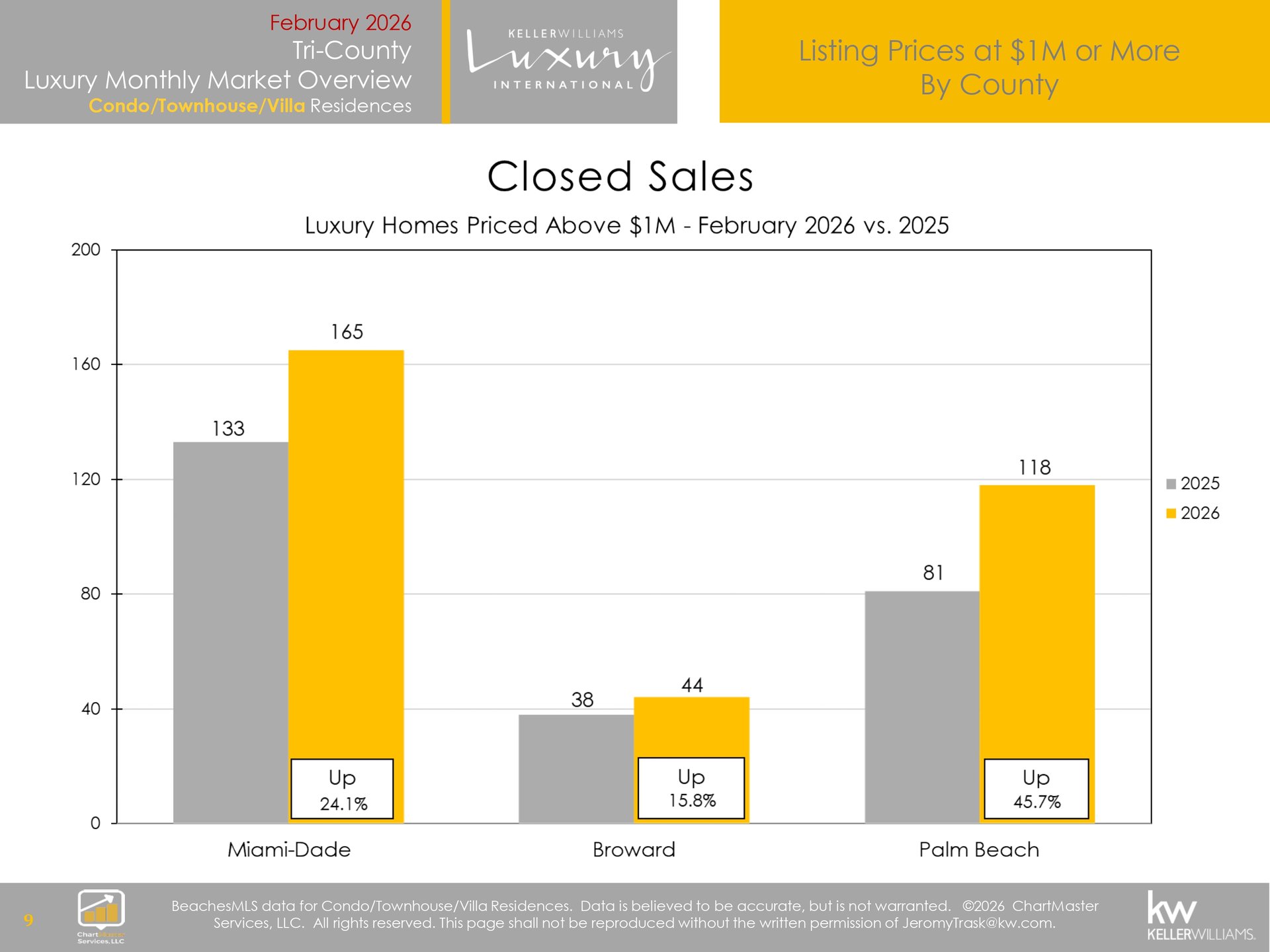 Next, let’s explore the luxury market—Condos, Townhouses, and Villas priced at $1 million and above. This year-over-year review across Miami-Dade, Broward, and Palm Beach counties provides insights into trends in pricing, sales, and inventory for high-end properties.