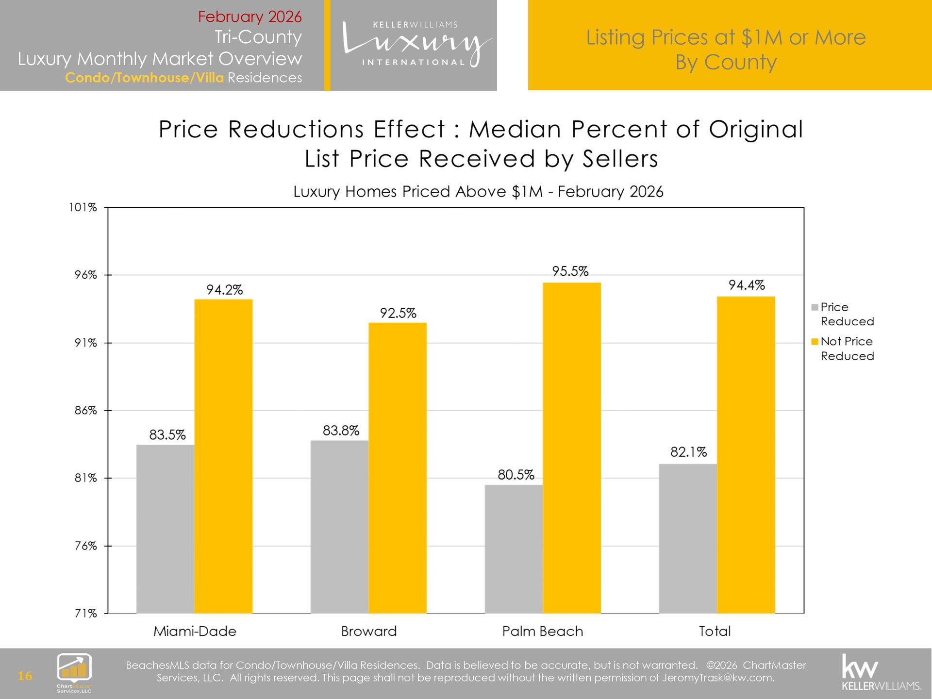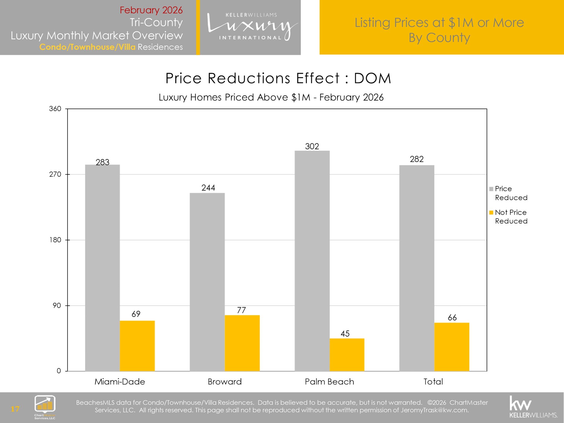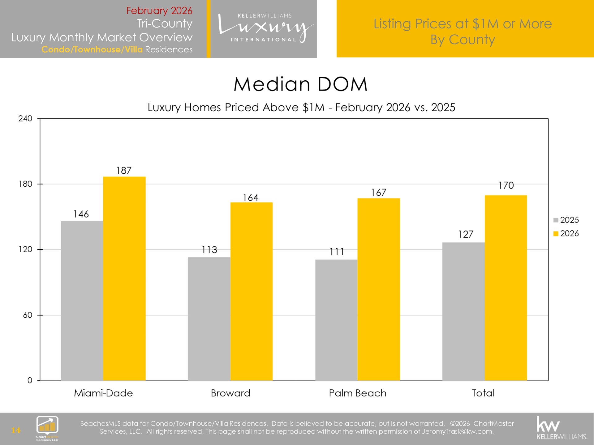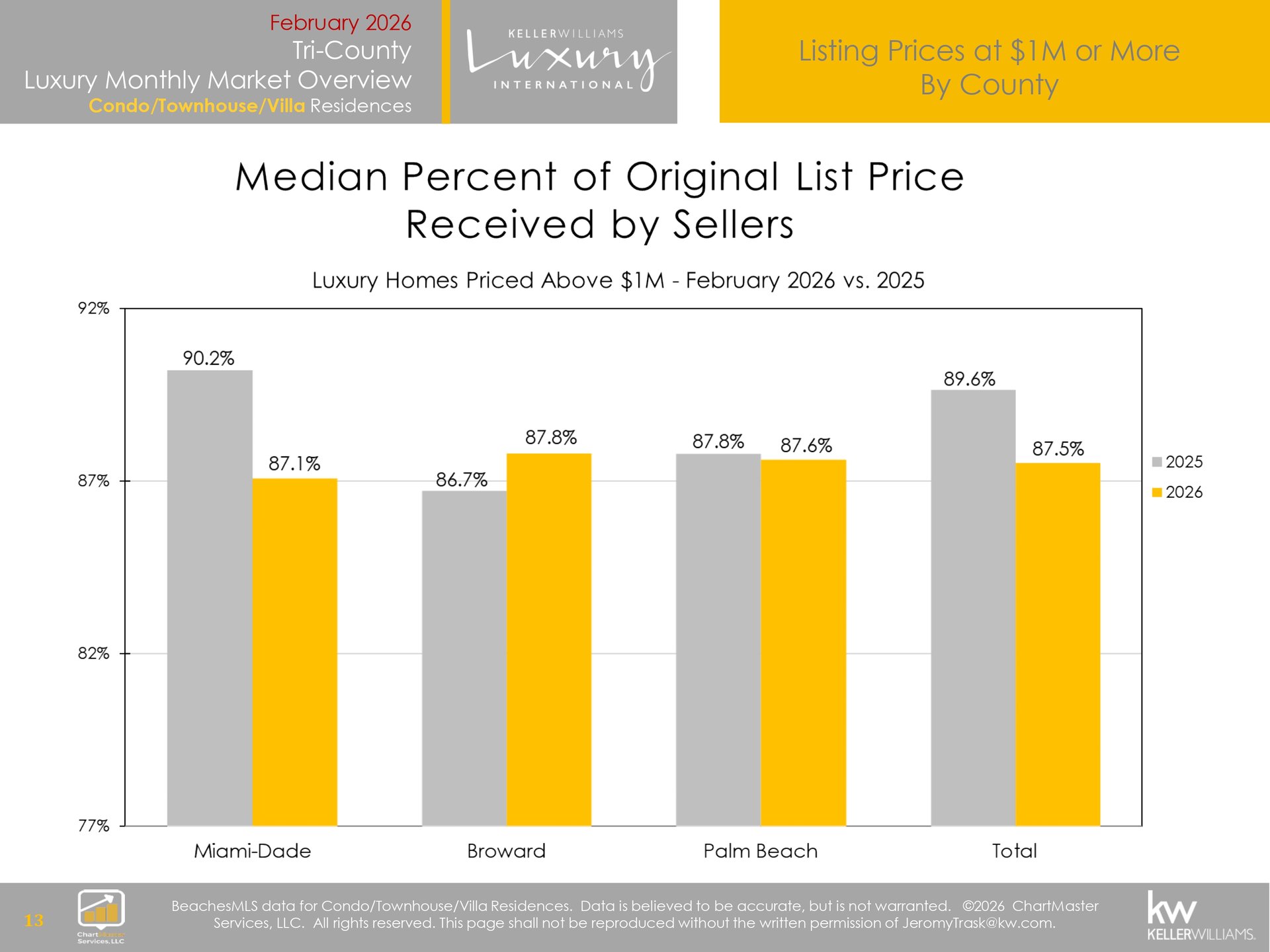 Next, let’s explore the luxury market—Condos, Townhouses, and Villas priced at $1 million and above. This year-over-year review across Miami-Dade, Broward, and Palm Beach counties provides insights into trends in pricing, sales, and inventory for high-end properties.