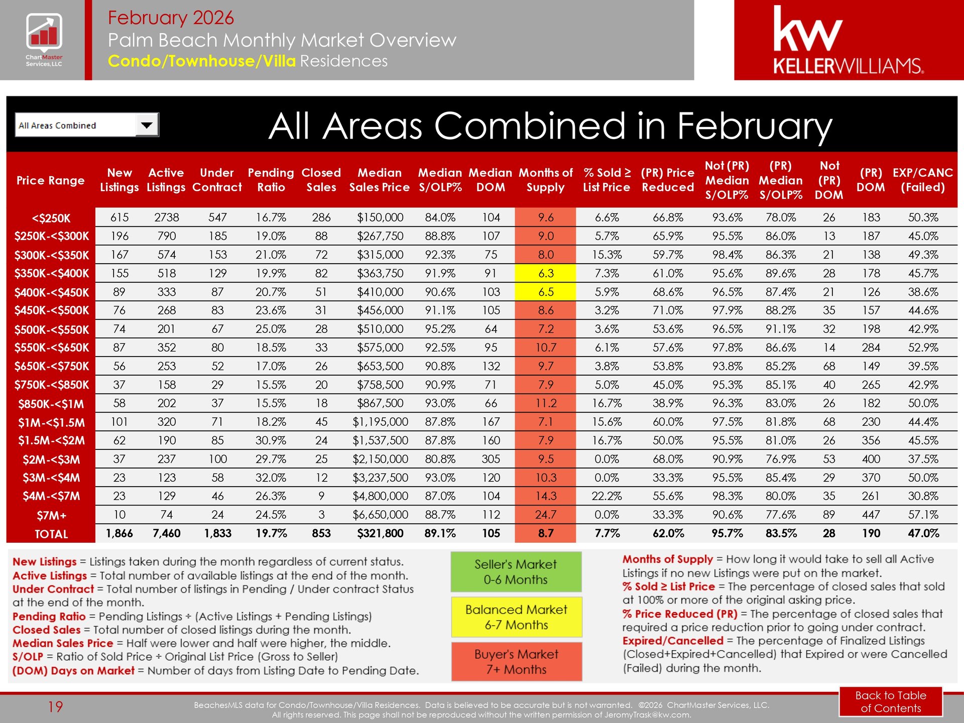Stay up to date with the latest market activity for Condos, Townhouses, and Villas in the Tri-County area, covering Miami-Dade, Broward, and Palm Beach counties. This year-over-year report highlights key trends in pricing, sales, and inventory, giving you a clear snapshot of this market segment.
