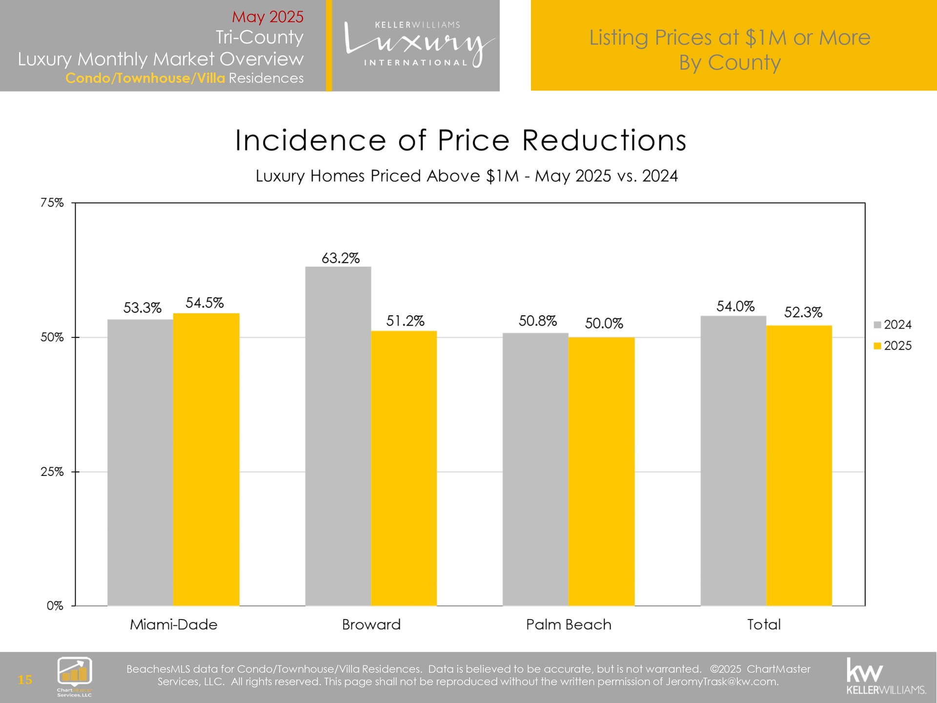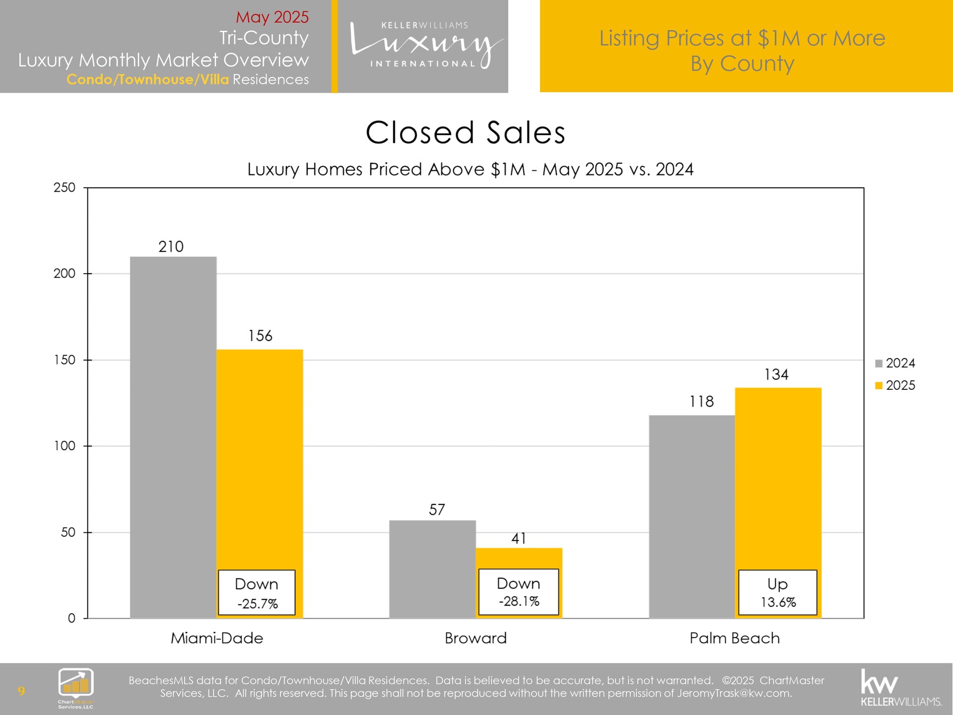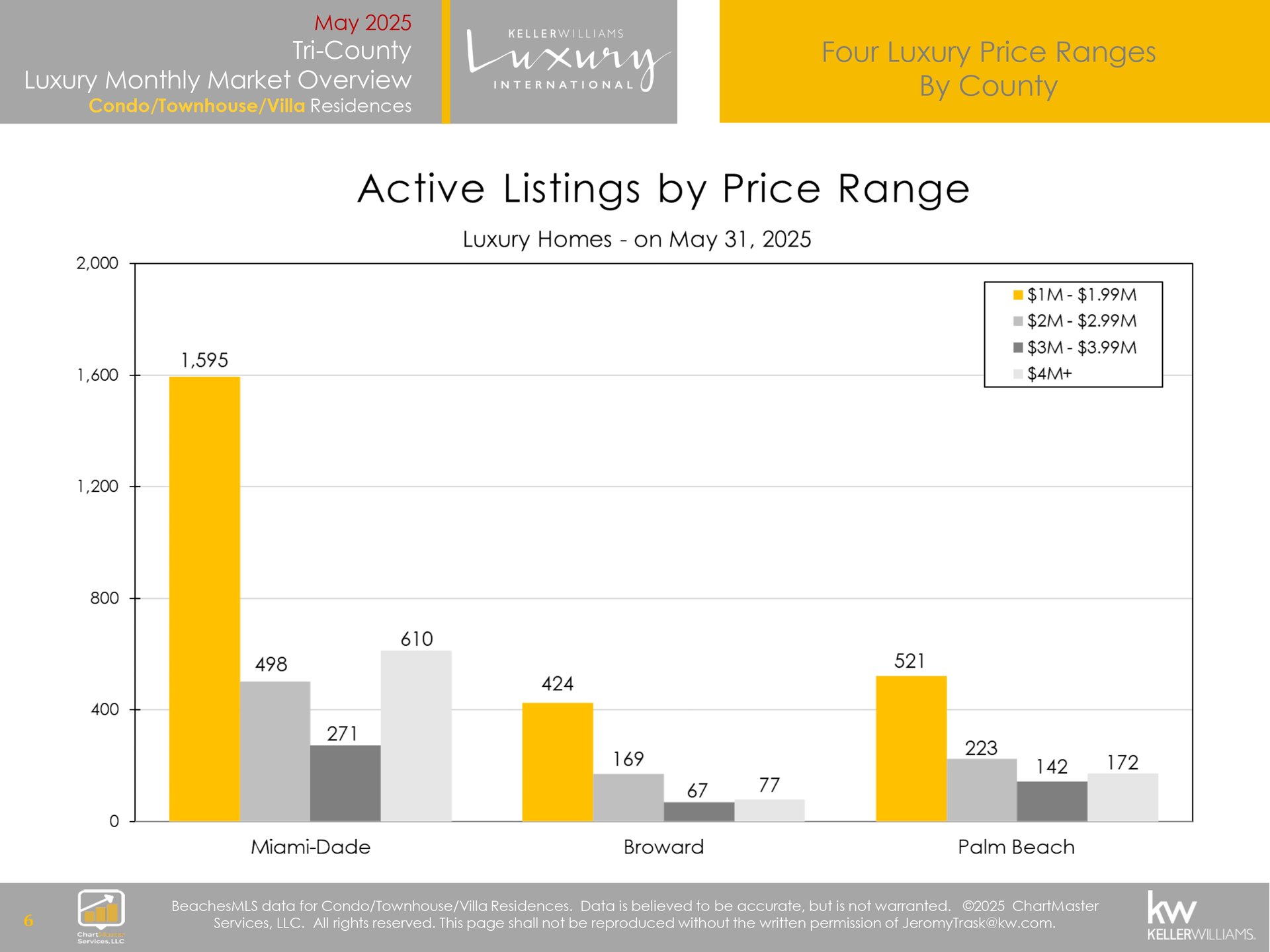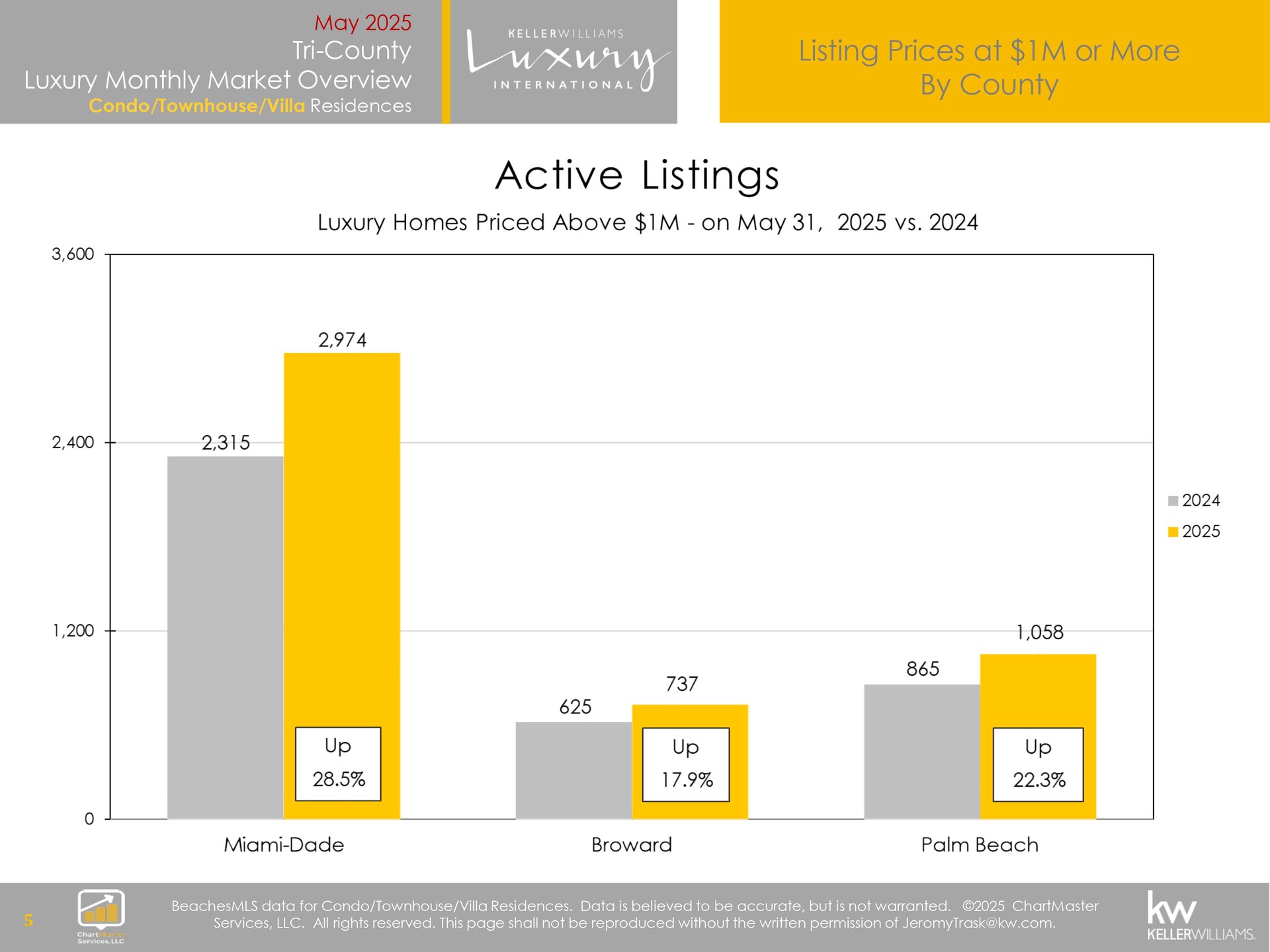 Next, let’s explore the luxury market—Condos, Townhouses, and Villas priced at $1 million and above. This year-over-year review across Miami-Dade, Broward, and Palm Beach counties provides insights into trends in pricing, sales, and inventory for high-end properties.
