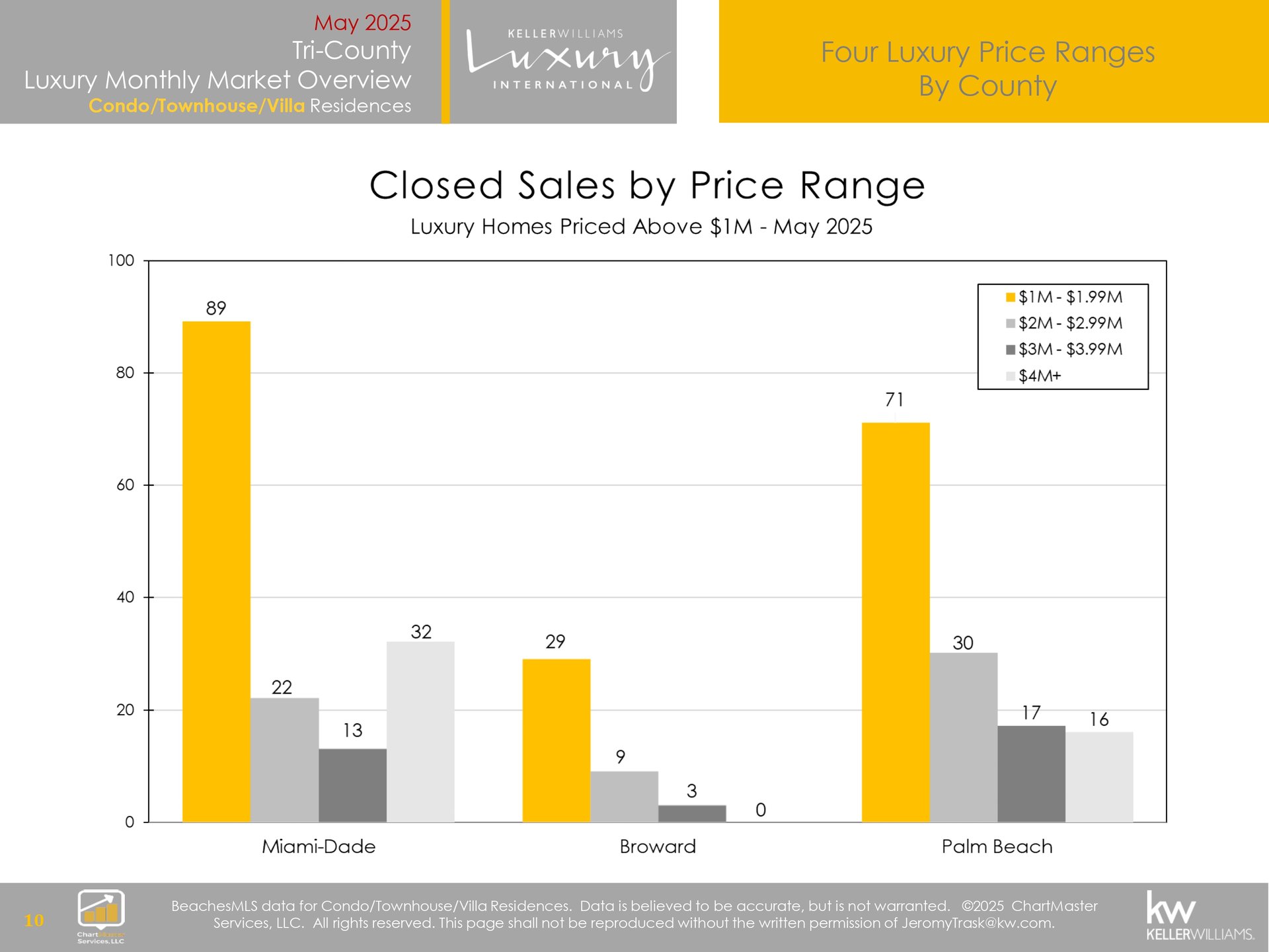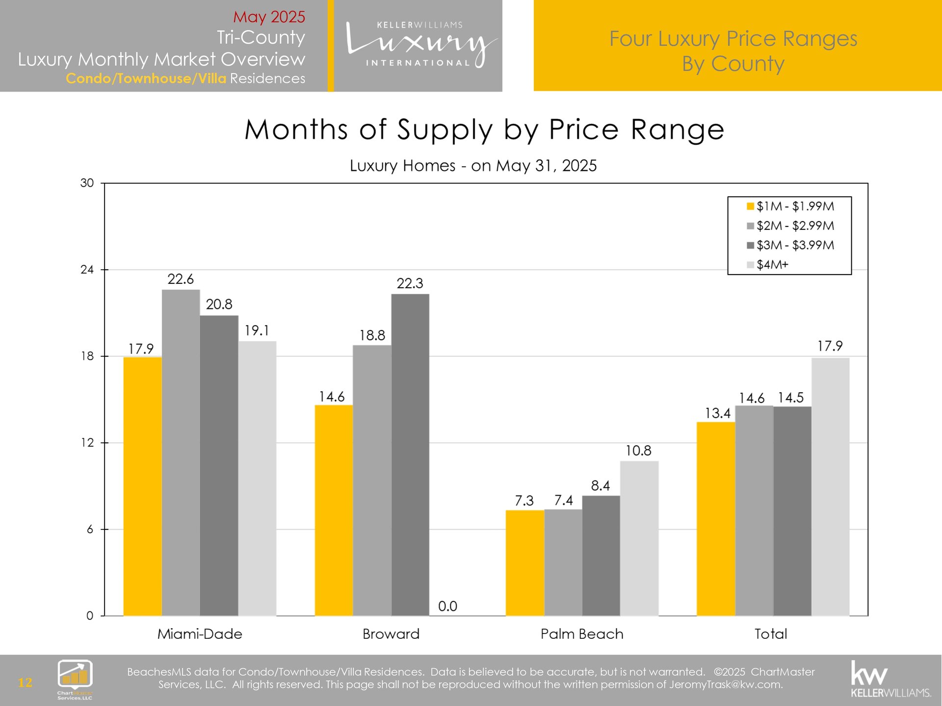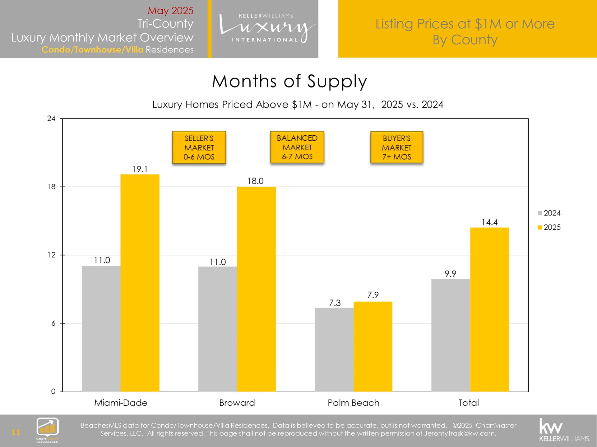 Next, let’s explore the luxury market—Condos, Townhouses, and Villas priced at $1 million and above. This year-over-year review across Miami-Dade, Broward, and Palm Beach counties provides insights into trends in pricing, sales, and inventory for high-end properties.