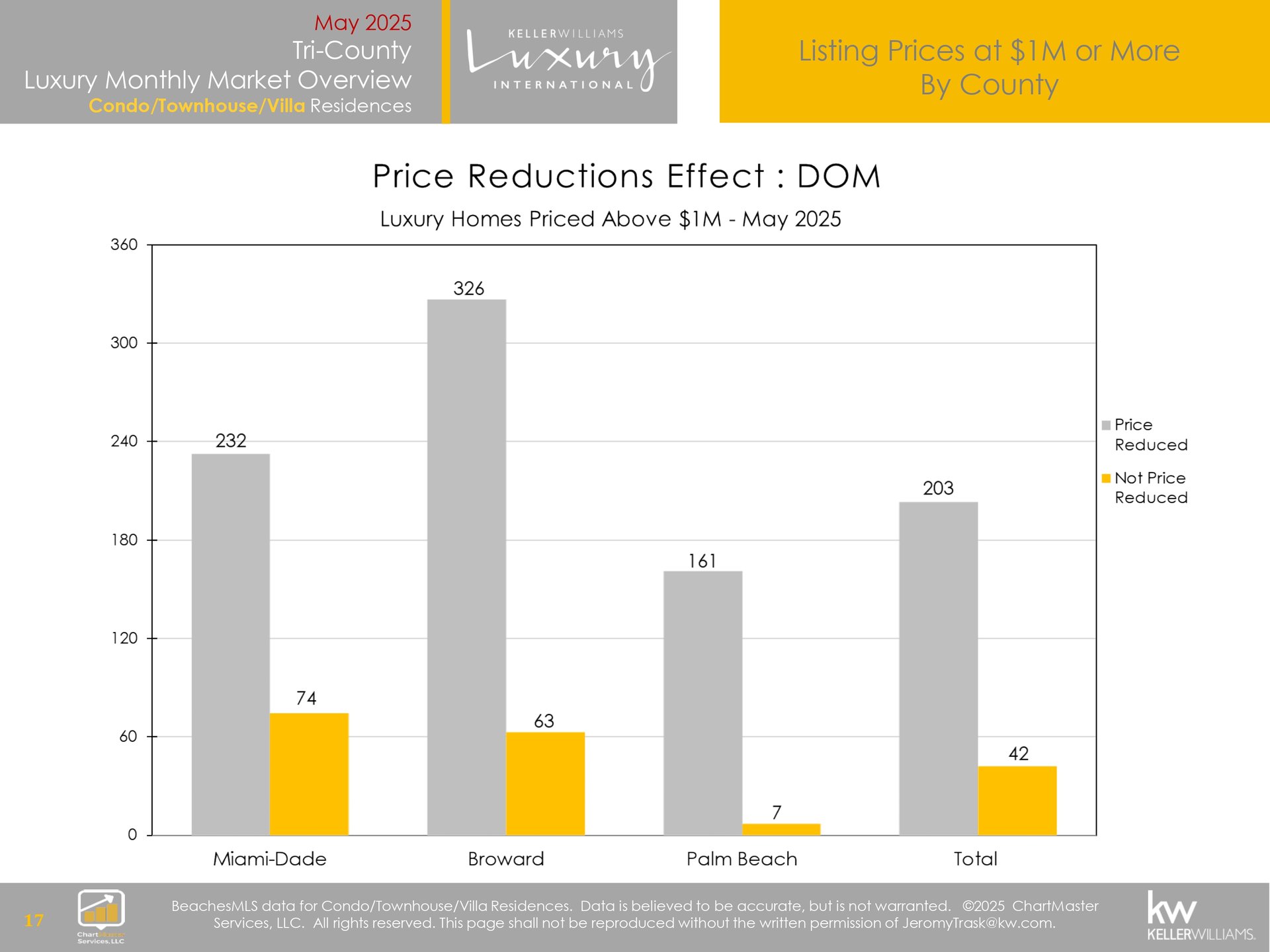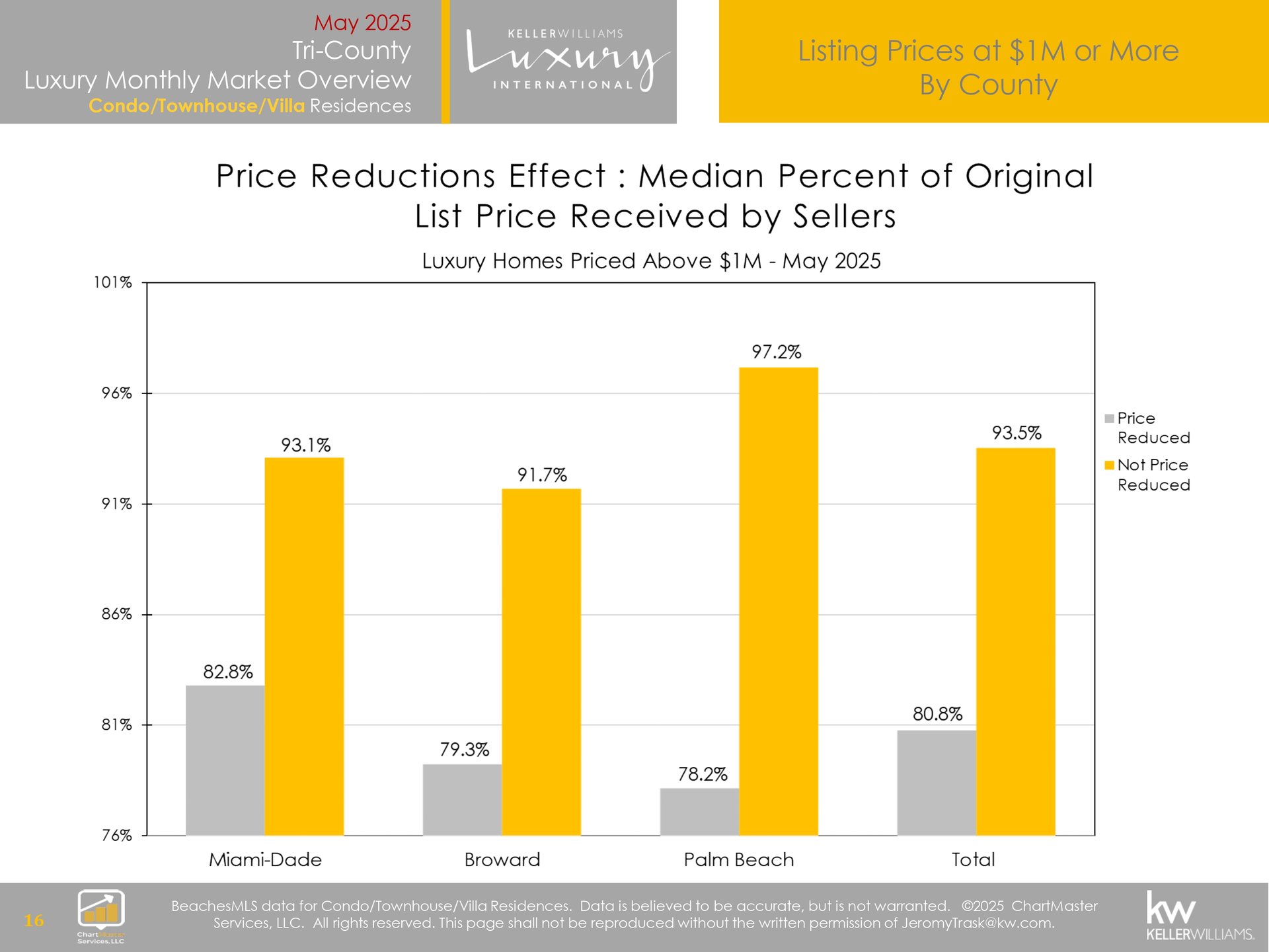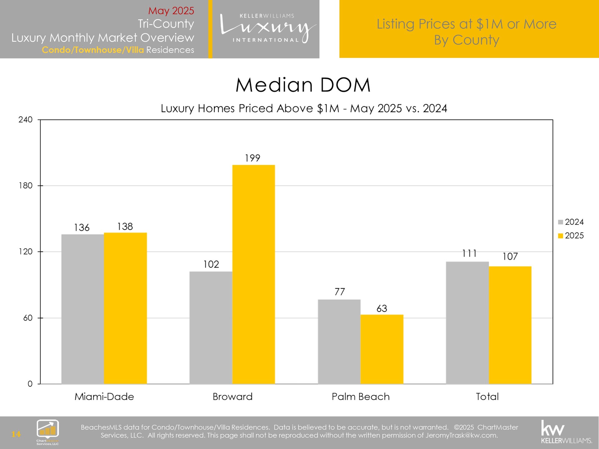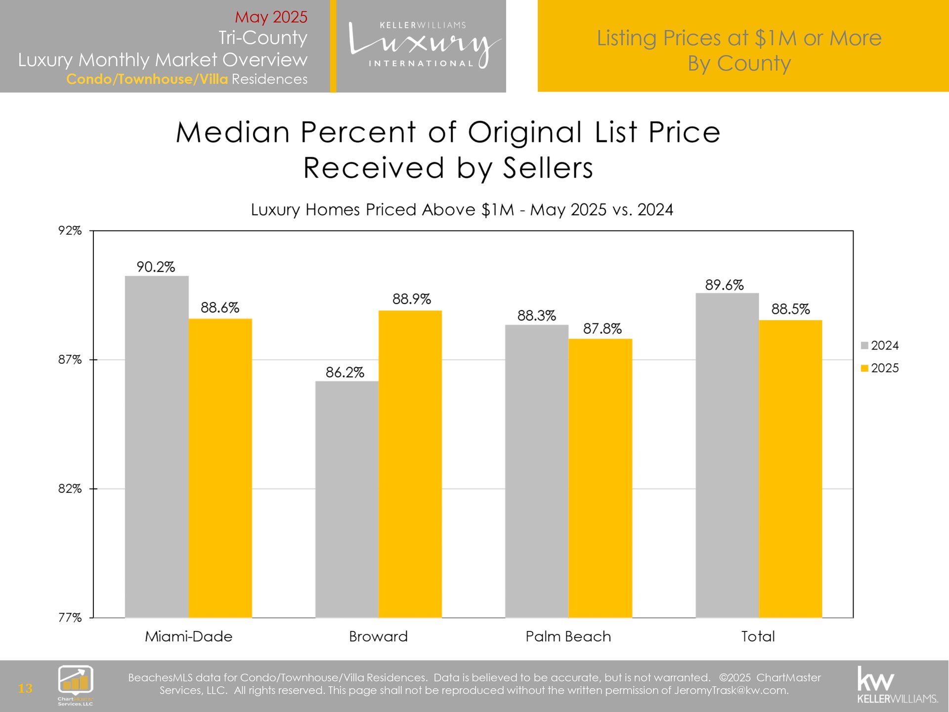 Next, let’s explore the luxury market—Condos, Townhouses, and Villas priced at $1 million and above. This year-over-year review across Miami-Dade, Broward, and Palm Beach counties provides insights into trends in pricing, sales, and inventory for high-end properties.