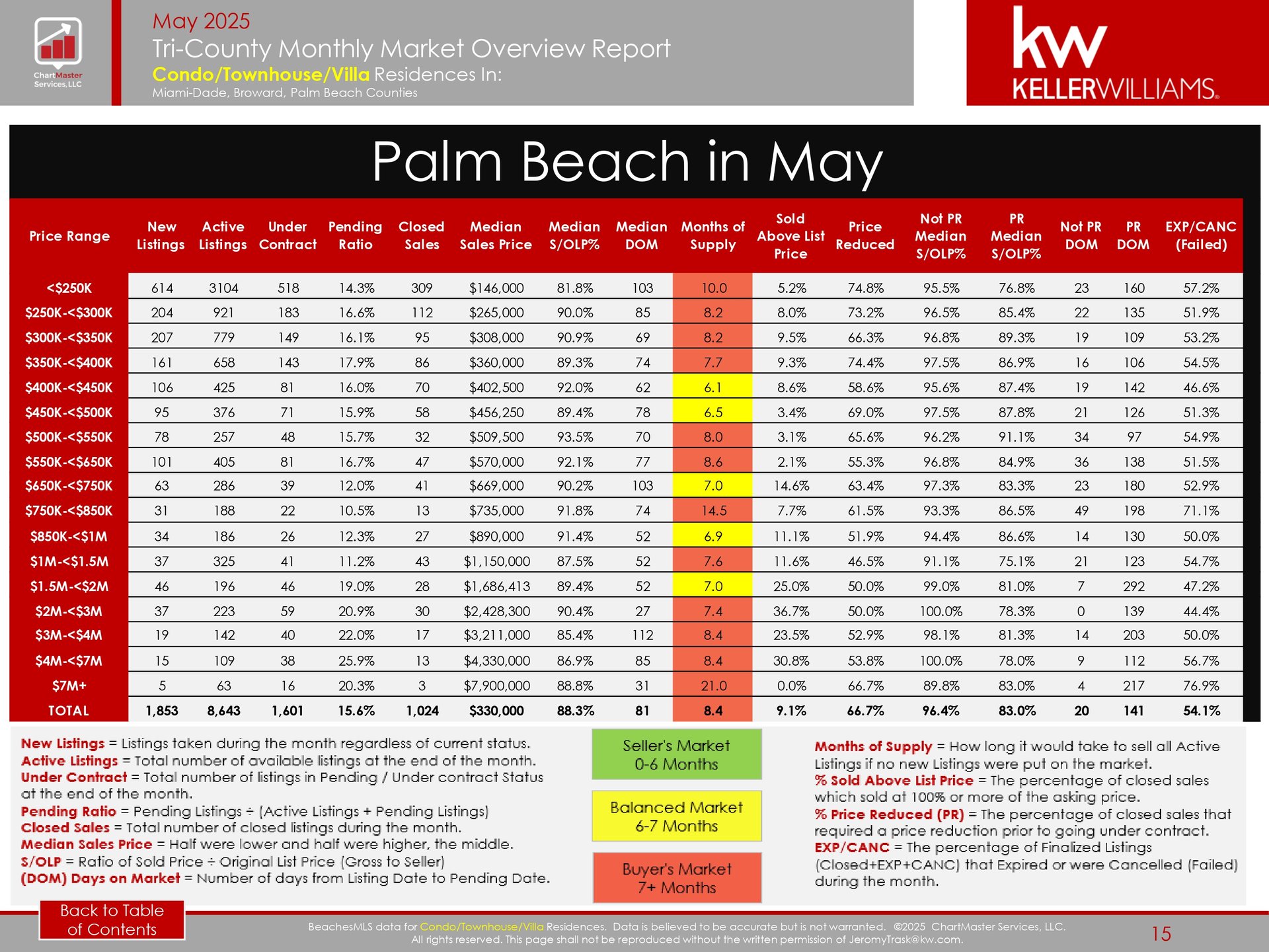 Stay up to date with the latest market activity for Condos, Townhouses, and Villas in the Tri-County area, covering Miami-Dade, Broward, and Palm Beach counties. This year-over-year report highlights key trends in pricing, sales, and inventory, giving you a clear snapshot of this market segment.